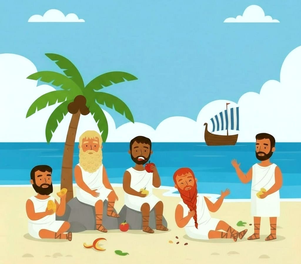 Asi que otra vez, Ulises y sus marineros nadaron hasta otra isla nueva.